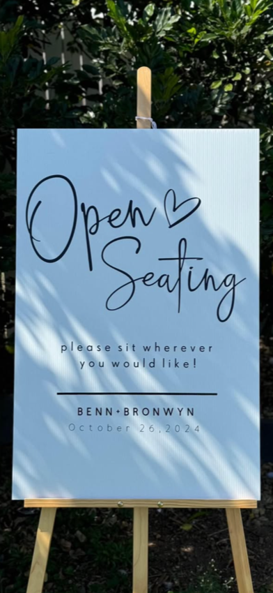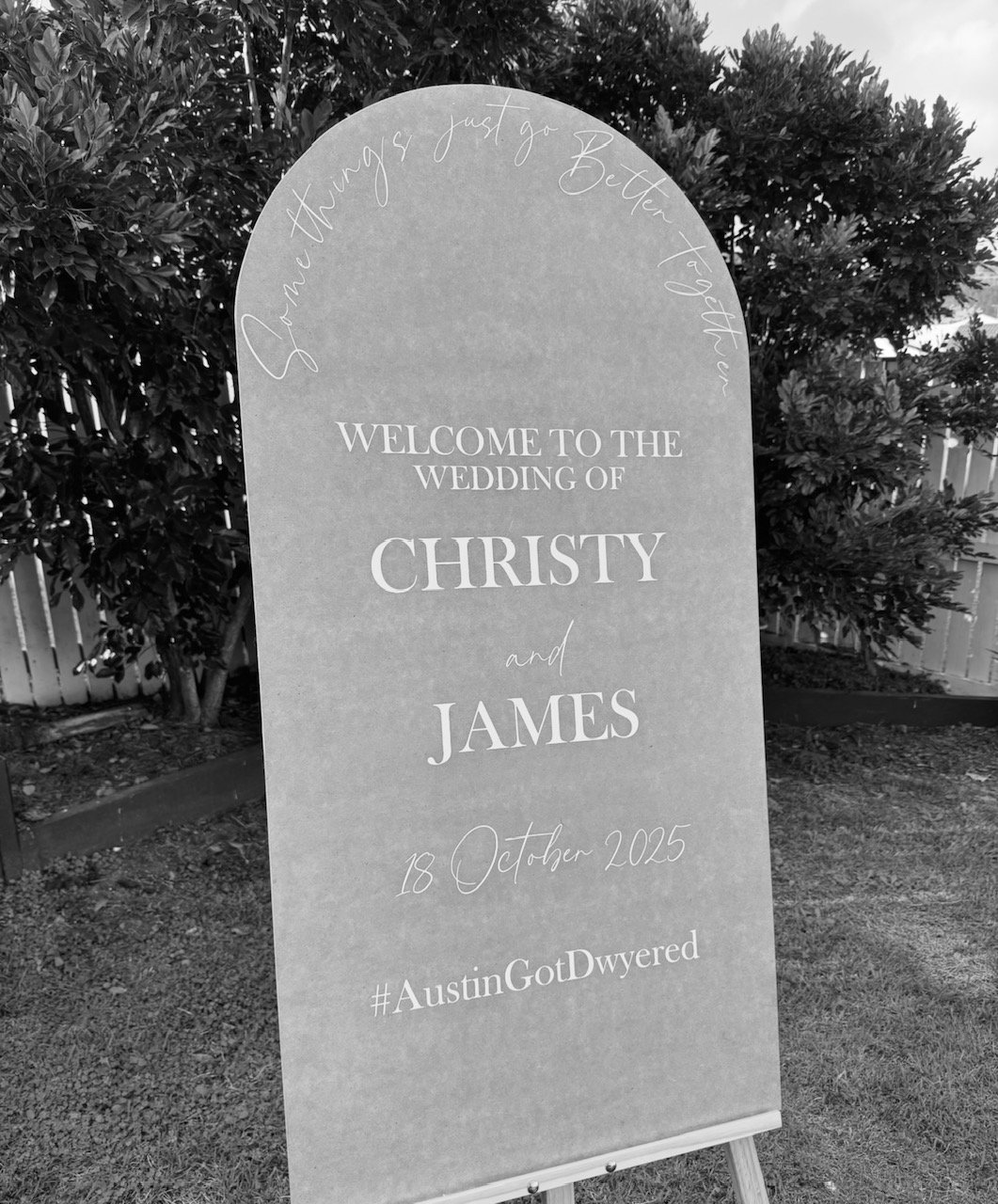 Your ceremony and reception signage can be completely customised to suit your style and vision. Available in a range of materials, including corflute, wooden MDF, acrylic, and cloth, and with a variety of finishes, these signs can be used for a welcome sign, open seating, unplugged ceremony, order of ceremony, and so much more — the list is endless!